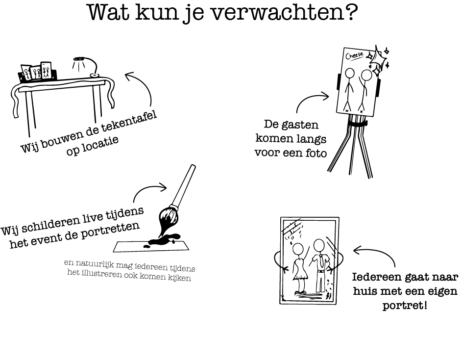 Er zijn verschillende opties mogelijk bij het boeken van de live-painting, maar bij allemaal komen we naar locatie om je gasten te illustreren! Welke optie past het beste bij jou?