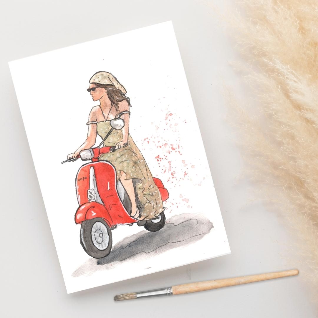 Ongevouwen A6 postcard met een aquarel schildering van een meisje op een Vespa door a Girl in the Field.